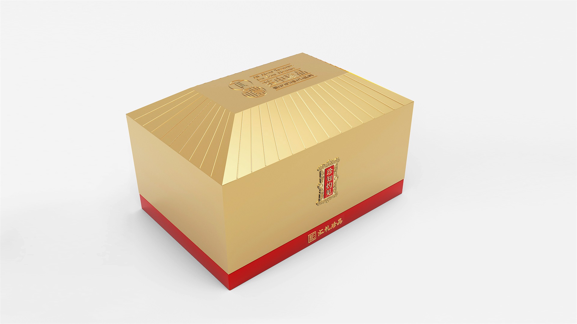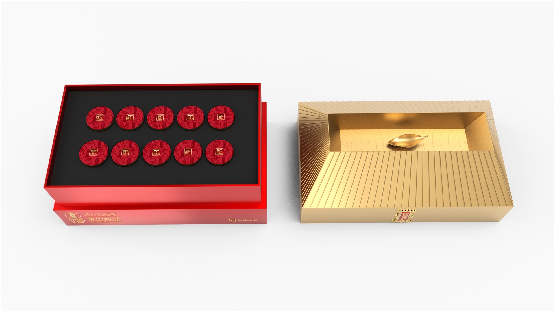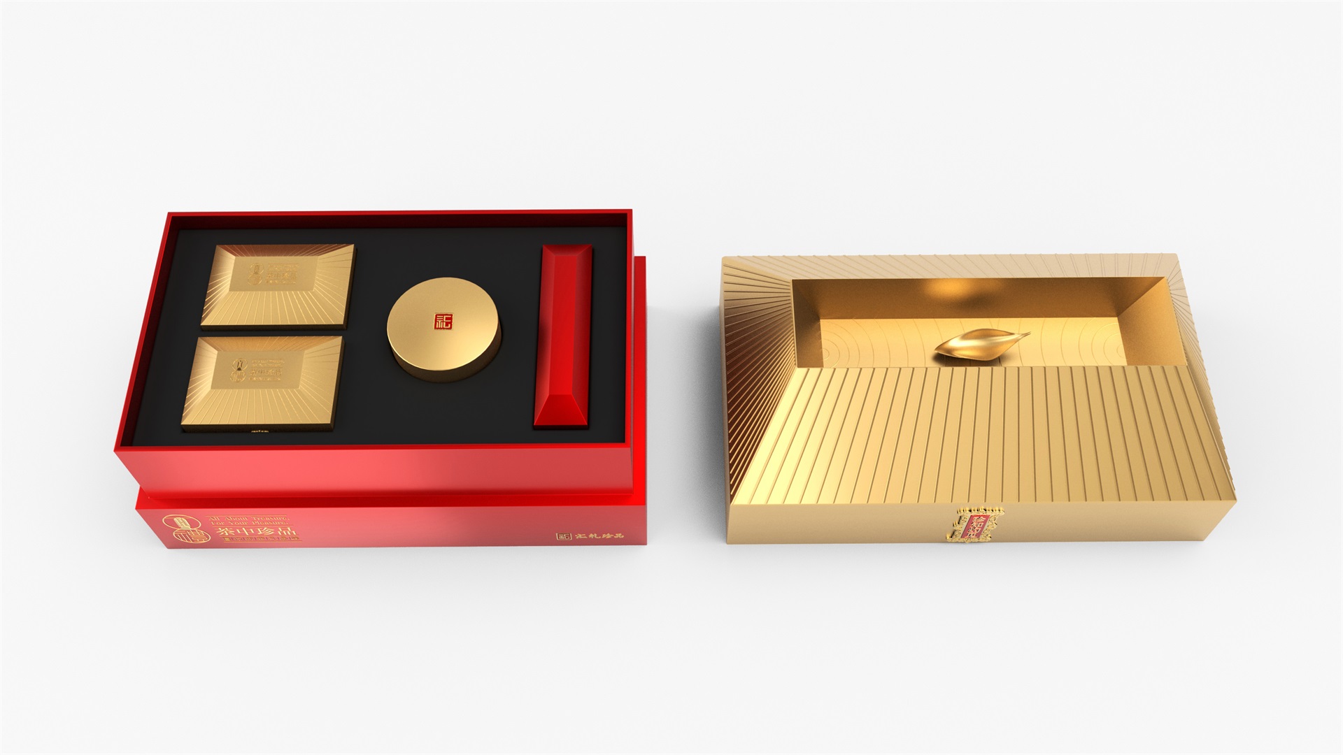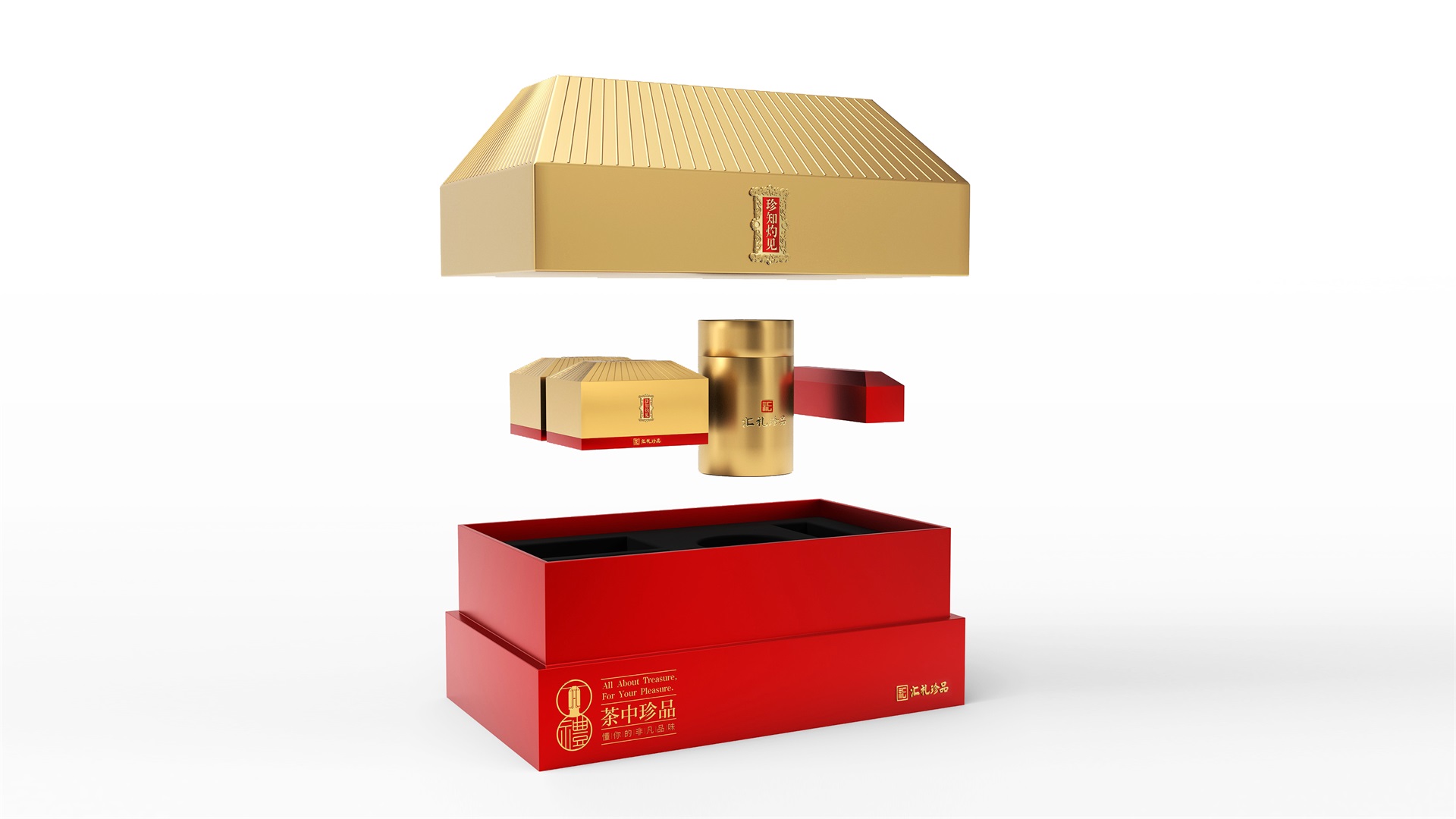 汇礼珍品包装设计,基于产品品级为茶中王者级别,J9九游国际站所以包装整体造型采用中国古代地位的皇家元素:宫殿为设计灵感进行设计,包装上盖为金色宫殿屋檐造型,斜面上也装饰了代表瓦片的条纹,上盖中部内陷,底部使用水纹铺底,在水纹上飘着一片金色的茶叶,高山流水觅知音,在一个上盖营造出了基于高端气质上,茶道与人道相融的意境画面;在上盖的正面中部,使用宫殿匾额形式作为展示包装的品类名称,将包装的宫殿造型进一步完善。支撑金色宫殿下方的红色地台作为包装下部,在正面放置文字信息和品牌标志。整体采用天地盖的形式,使开盖具备仪式感。内部分包装与外部形式大体相同,但有所以简略,保证整体性的同时也保证整体包装不会过于繁复,保持平衡。